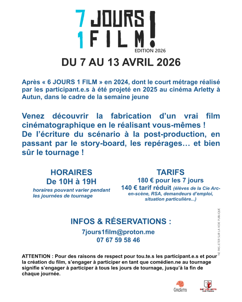 Après « 6 JOURS 1 FILM » en 2024, dont le court métrage réalisé par les participant·e·s a été projeté en 2025 au cinéma Arletty à Autun, dans le cadre de la semaine jeune.