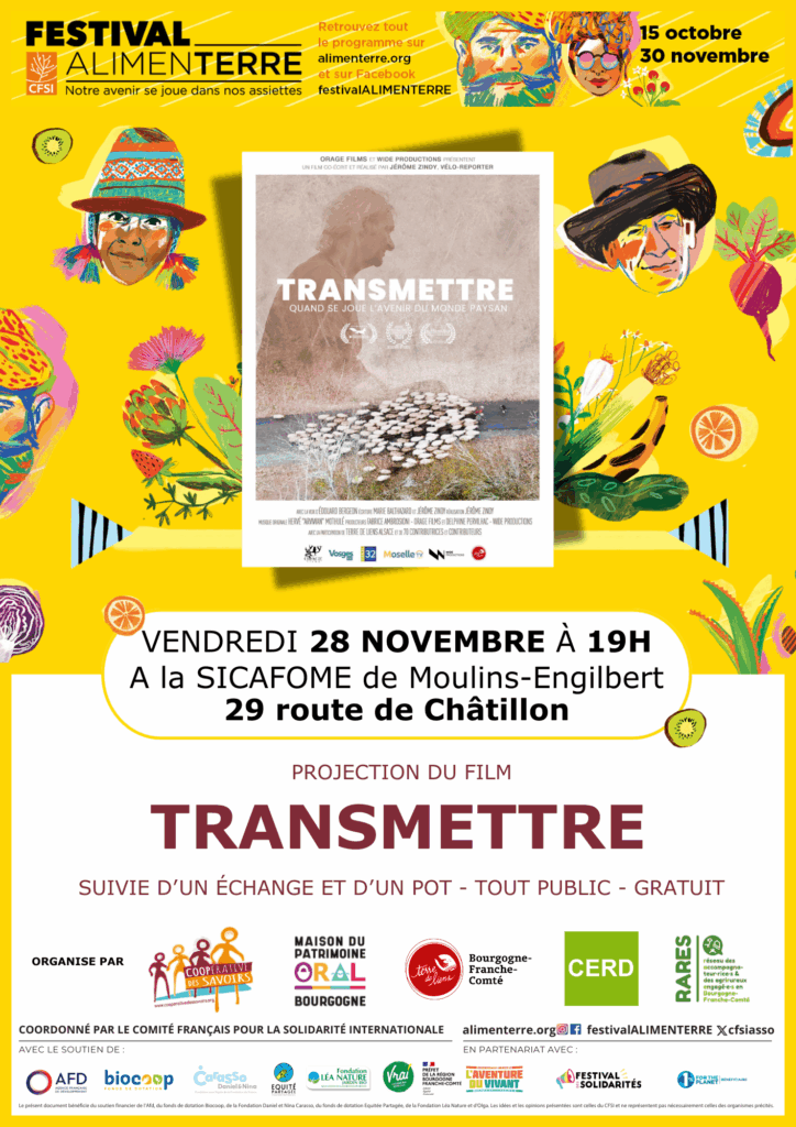 Projection du film « Transmettre » dans le cadre de Alimenterre à la Sicafome. C’est un festival de films documentaires qui amène les citoyens à s’informer et comprendre les enjeux agricoles et alimentaires en France et dans le monde.