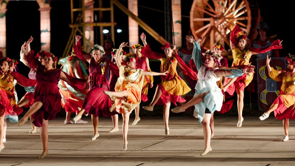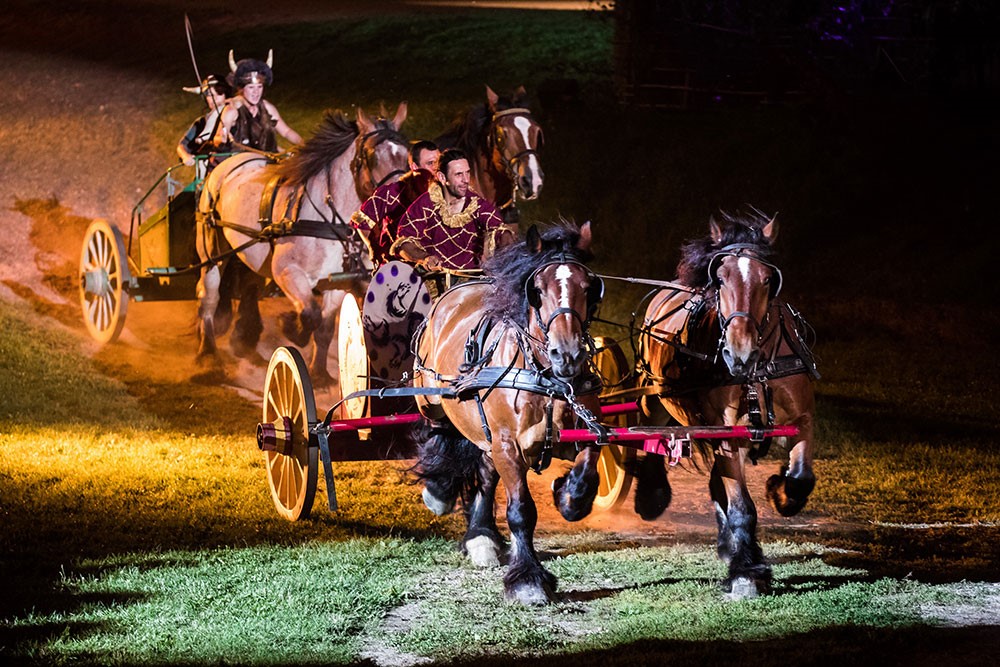 Course de chars, combat de gladiateurs, danses, scènes de feu, tournoi de chevalerie et parade de voltigeurs rythment énergiquement ce nouveau spectacle qui se termine par l’arrivée triomphale du roi François 1er à Autun, la Rome française.