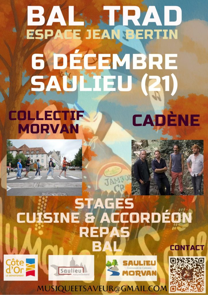 Bal trad à Saulieu le 6 décembre à l’Espace Jean Bertin ! Ambiance chaleureuse avec le Collectif Morvan & Cadène, stages cuisine et accordéon pour se régaler avant un grand bal convivial. Réservez votre soirée pour danser, partager et découvrir les saveurs du Morvan.