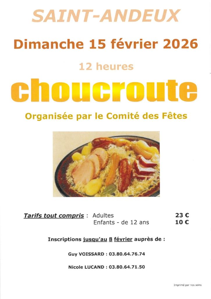 Choucroute organisée par le comité des fêtes. Réservation jusqu’au 8/02 au 03 80 64 76 74