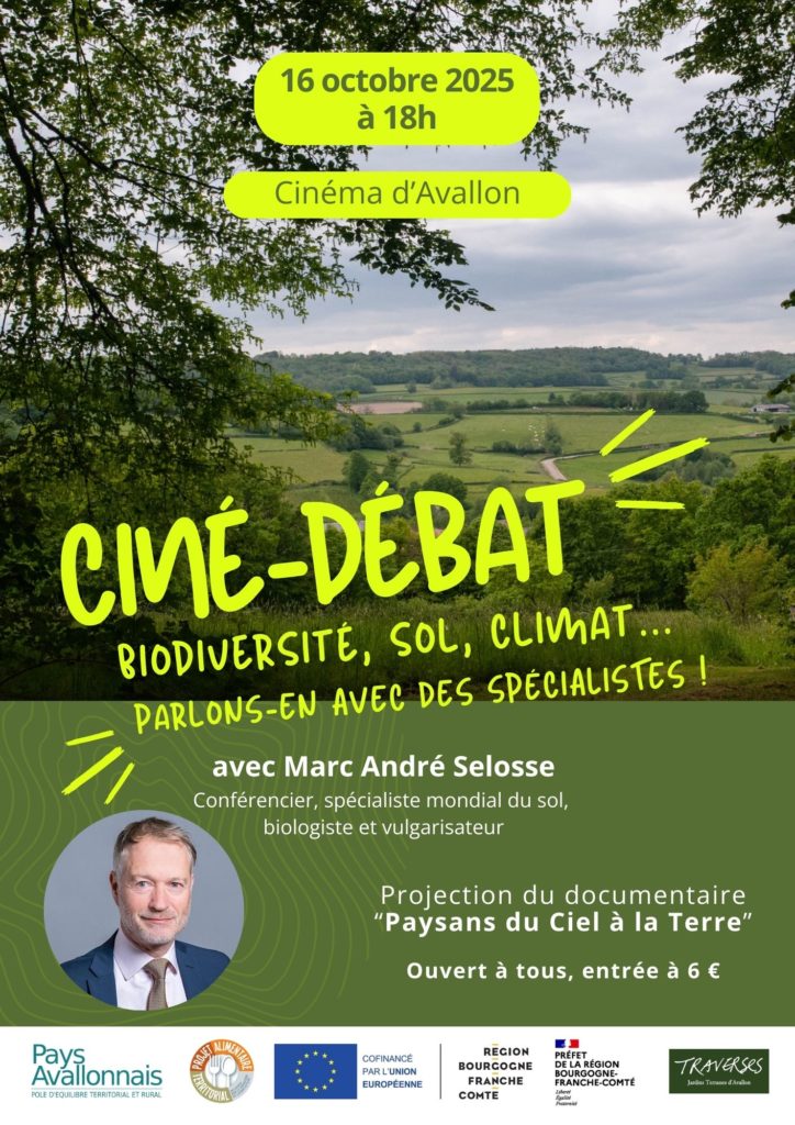 Soirée exceptionnelle à Avallon le 16 octobre ! Vous vous intéressez au changement climatique, à l’agriculture, aux sols et à la biodiversité ? Ne manquez pas la projection du documentaire « Paysans du Ciel à la Terre » suivie d’un grand débat animé par le spécialiste mondial du sol, Marc-André Selosse !