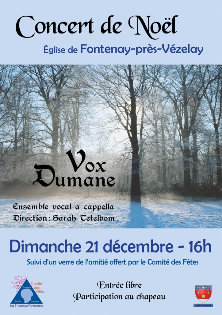 Concert de Noël Vox Dumane; ensemble vocal à cappella. Direction Sarah Tetelbom; suivi d’un verre de l’amitié offert par le Comité des Fêtes