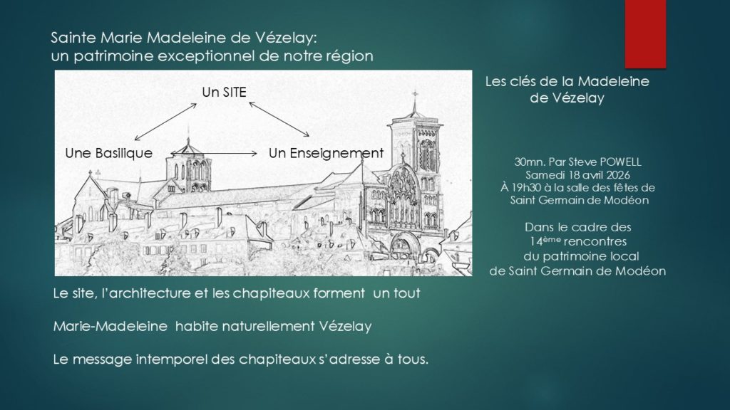 Venez assister à la communication de Steve Powell « Les clés de la Madeleine de Vézelay », dans le cadre des 14èmes rencontres du patrimoine local de Saint-Germain-de-Modéon
