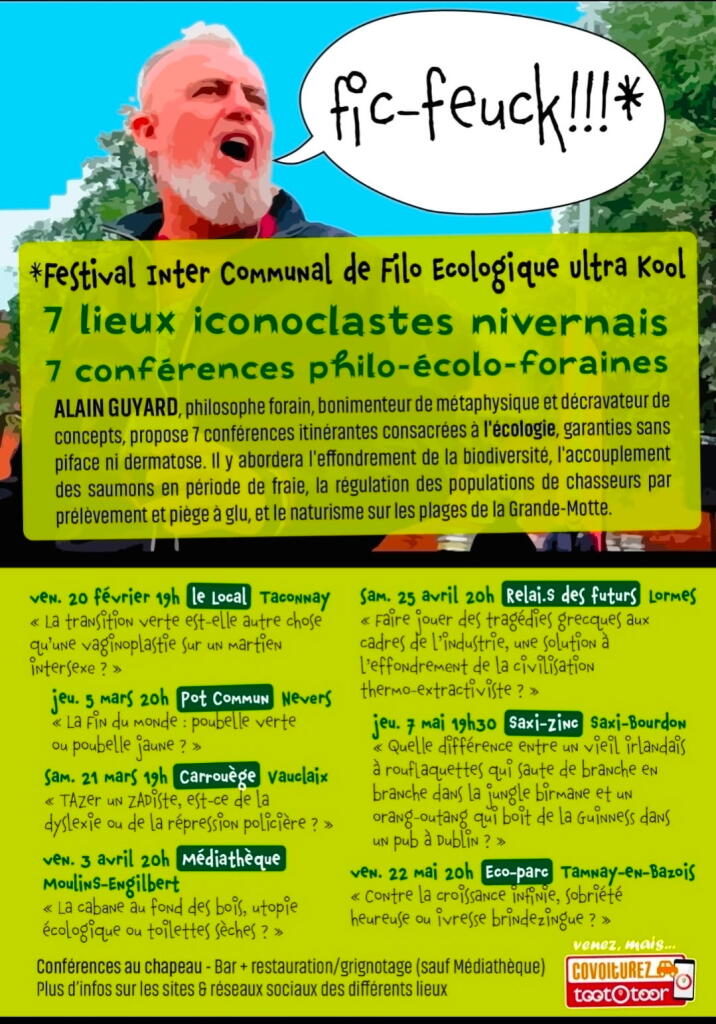 Dans le cadre du Festival Inter-Communal de Filo Ecologique ultra-kool (Ficc-Feuck!!!*), Alain Guyard, philosophe forain, bonimenteur de métaphysique et décravateur de concepts propose une conférence itinérante consacrée à l’écologie.