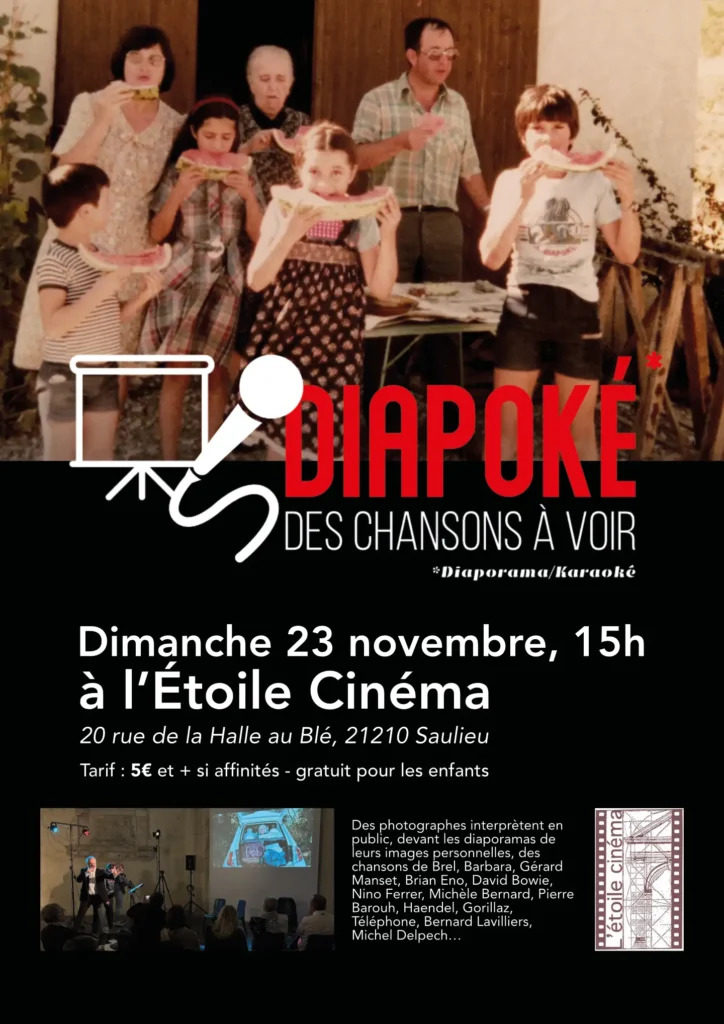 Diapoké est la contraction de Diaporama et Karaoké. Il s’agit pour un photographe de chanter en public en accompagnement de la projection d’un diaporama issu de son travail photographique personnel ou familial. C’est la rencontre entre narration photographique et petits chefs-d’œuvre textuels que sont