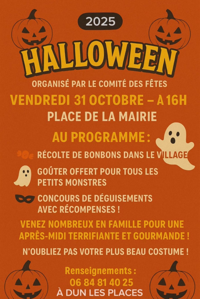 Au programme : récolte de bonbons dans le village, goûter offert pour tous les petits monstres, concours de déguisement avec récompenses. Venez nombreux en famille pour une après midi terrifiante et gourmande, n’oubliez pas votre plus beau costume !