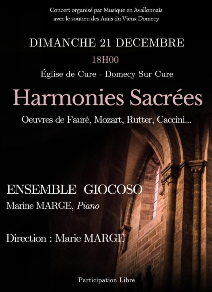 Organisé par Musique en Avallonnais avec le soutien des Amis du Vieux Domecy, l’ensemble Giocoso propose « Harmonie sacrées » (Fauré, Mozart, Rutter, Caccini…) avec Marine Marge au piano.