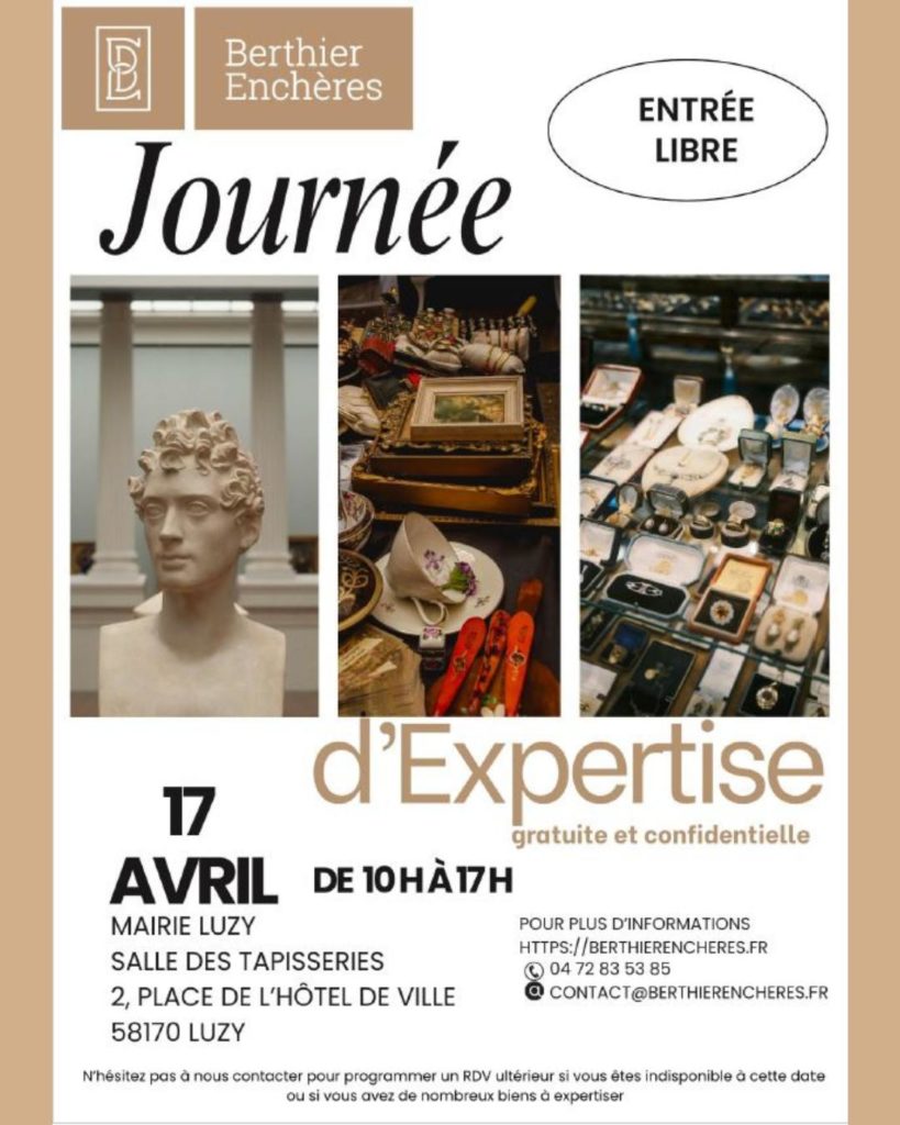 Originaire de Luzy, Alexandre Berthier a aujourd’hui créé sa maison de vente aux enchères à Lyon. Très attaché à la commune, le commissaire-priseur a tenu à organiser une journée d’estimations gratuites et confidentielles d’objets d’arts, bijoux, tableaux et divers, dans la salle des Tapisseries de Luzy. Expertise gratuite et confidentielle.