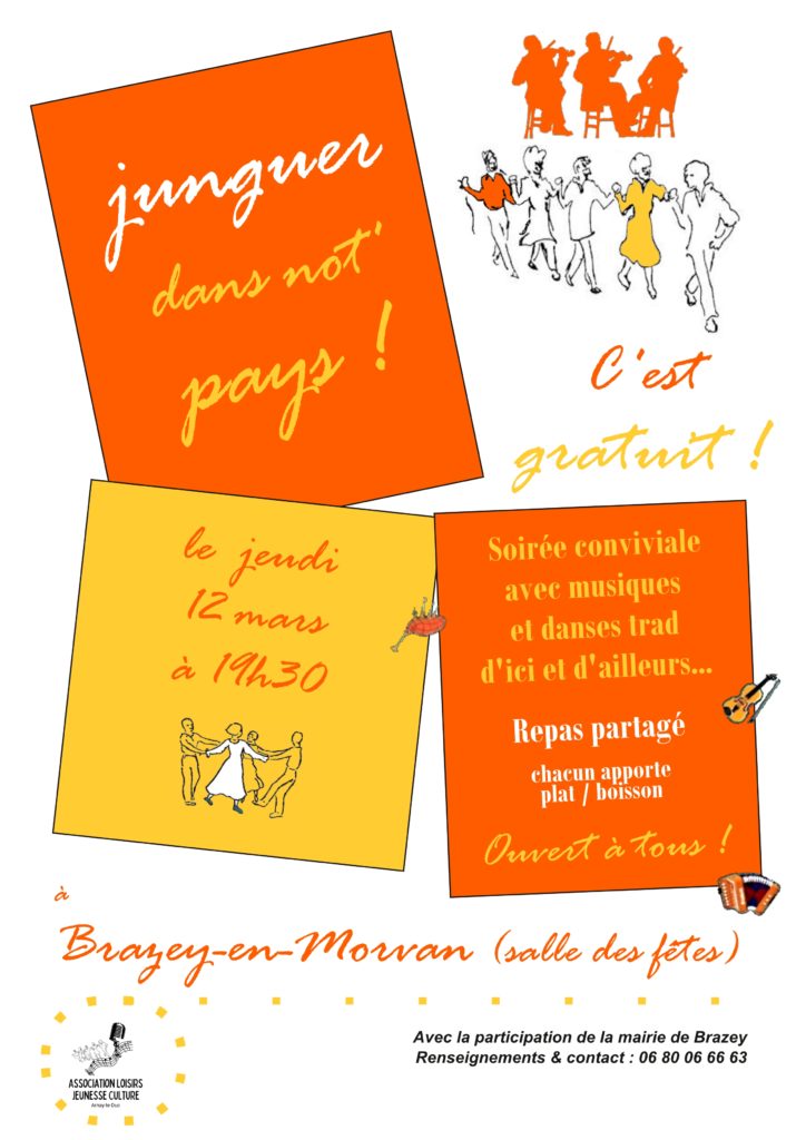 Le voyage musical dans les villages continue à Brazey en Morvan, avec un repas partagé, des musiciens, des danses, de la convivialité… N’hésitez pas à venir avec votre instrument !