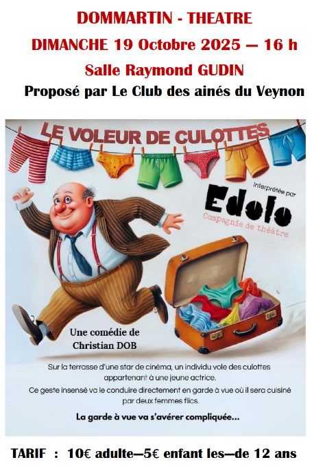 Le voleur de culottes Théâtre à 16h à la salle Raymond Gudin de Dommartin. Comédie de Christian Dob, proposée par le club des ainés du Veynon. Sur la terrasse d’une star de cinéma, un individu vole des culottes appartenant à une jeune actrice. Ce geste insensé va le conduire directement en garde à vue où il sera cuisiné par 2 femmes flics. La garde à vue va s’avérer compliquée…