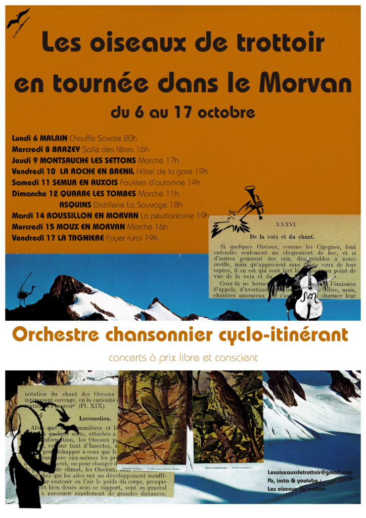 Du 6 au 17 octobre “Les Oiseaux de trottoir” en tournée dans le Morvan : Orchestre chansonnier cyclo-itinérant, concerts à prix libre et conscient.