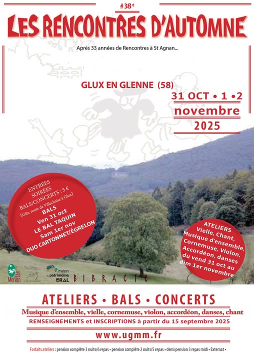 Les rencontres d’automne à Glux en Glenne. Ateliers : vielle, cornemuse, violon, accordéon, danses, chant. Bals, concerts : entrée soirée 5€ (gîte route de Villechaise à Glux) – Forfaits externat, ½ pension ou pension complète.