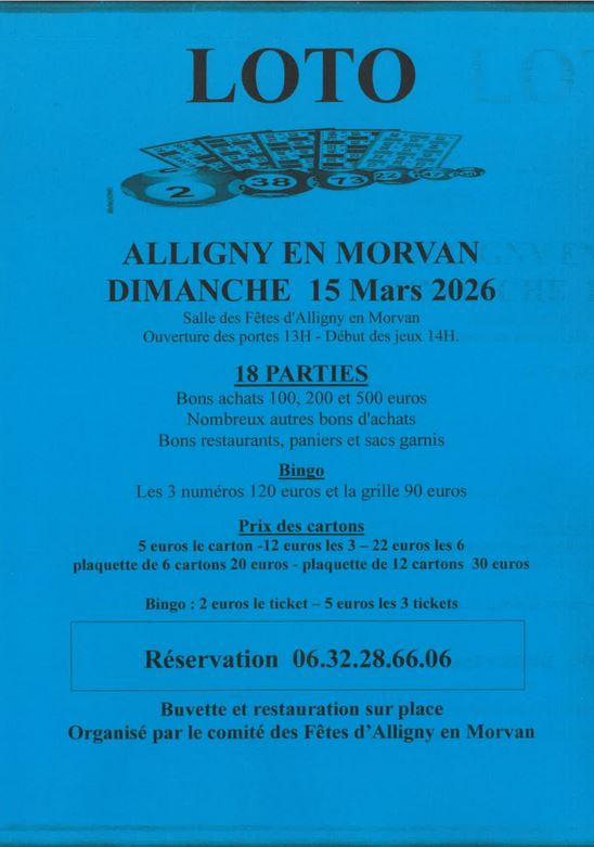 Loto à Alligny en Morvan. A la salle des fêtes. Ouverture des portes à 13h et début des jeux à 14h. Bons d’achat 100, 200, 500€, nombreux autres bons d’achat, restaurants, paniers, garnis. 18 parties, bingo. Organisé par le comité des fêtes. Buvette et restauration sur place. Réservation possible
