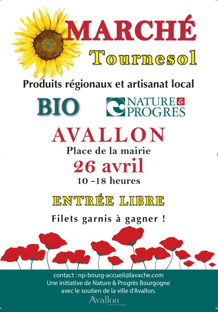 Le 26 avril, le Marché Tournesol, sur la Place de la Mairie. Un événement mettant à l’honneur les produits régionaux et l’artisanat local. Organisé en partenariat avec Nature & Progrès Bourgogne et avec le soutien de la ville d’Avallon, l’occasion idéale pour découvrir des saveurs authentiques et des créations uniques.