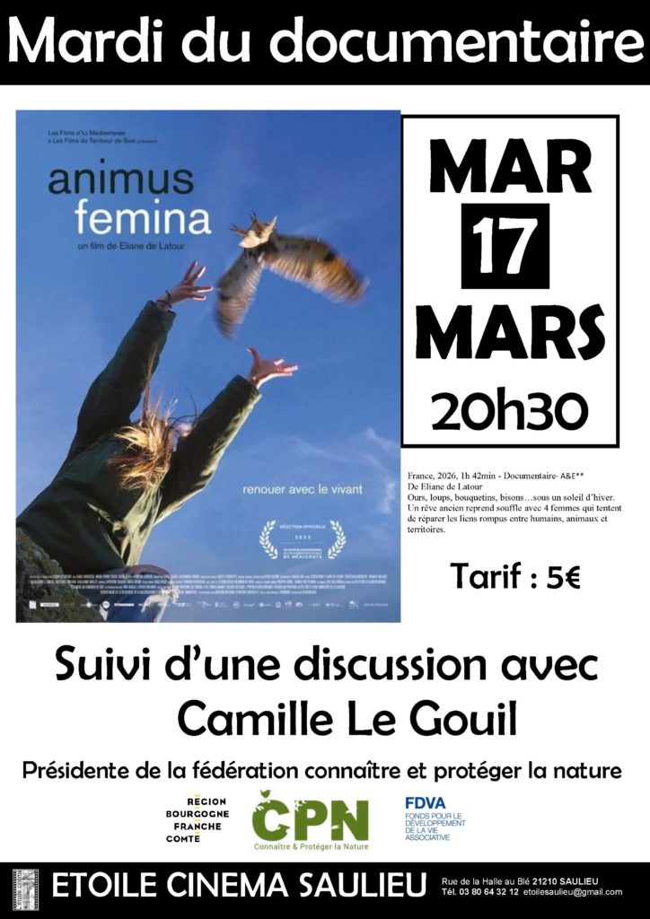 Mardi 17 mars à 20h30, découvrez le documentaire de Éliane de Latour, « ANIMUS FEMINA » qui sera suivi d’échanges avec Camille Le Gouil, présidente de l’association Connaître et Protéger la Nature.