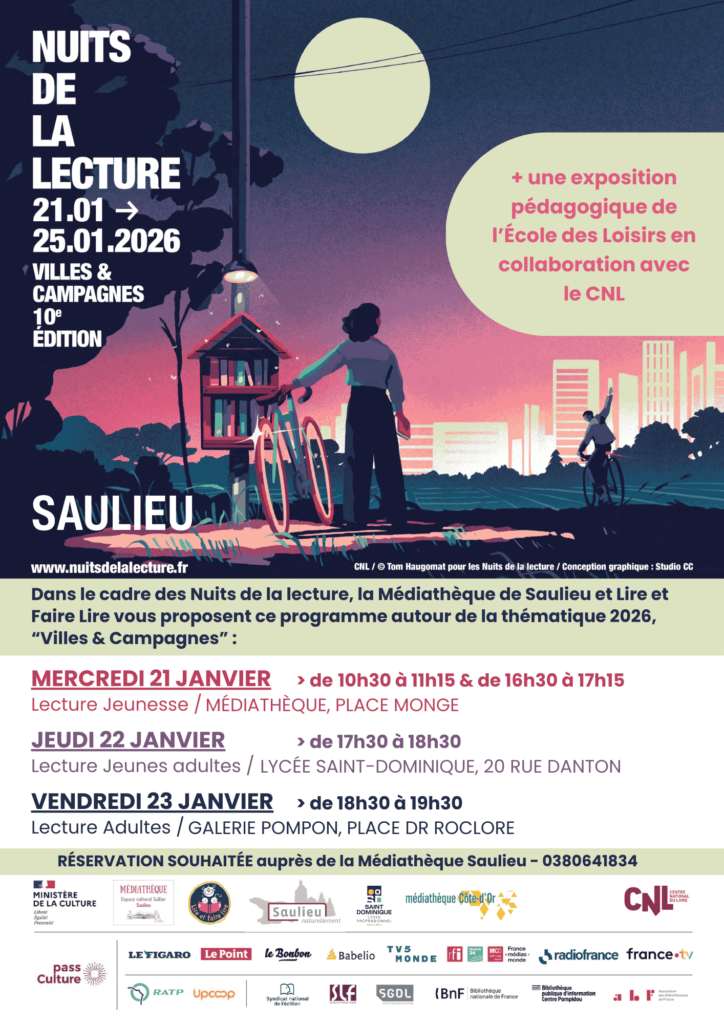 Pour la 10ème édition des Nuits de la lecture, la Médiathèque de Saulieu vous propose, en partenariat avec Lire et Faire Lire et le Lycée St Dominique, un programme destiné à tous les publics :