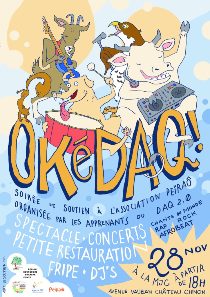 OKéDAQ A partir de 18h MJC de Château-Chinon avenue Vauban. Soirée de soutien à l’association Peïraô organisée par les apprenants du DAQ 2.0. Spectacle, concerts, chants du monde, Rap, Rock, Afrobeat. Petite restauration. Fripe.