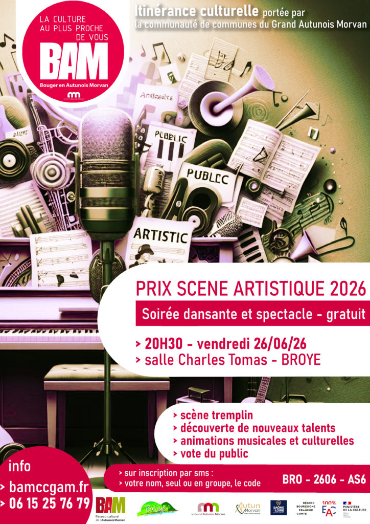Le réseau culturel BAM, vous offre l’occasion unique de vous produire sur scène et de nous faire découvrir votre talent lors de notre troisième édition du « Prix Scène Artistique 2026 » le 26 juin à 20h30 à la salle des fêtes Charles Tomas à Broye. Une scène tremplin où danse et spectacle sont au rendez vous sous l’œil bienveillant de notre jury et du public.
