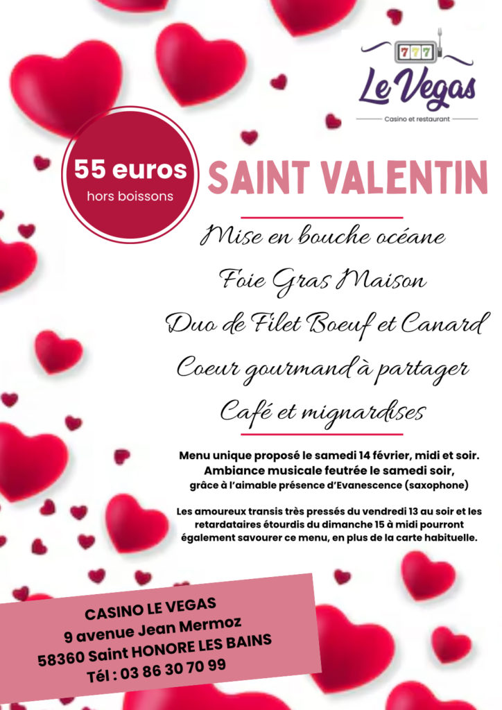 Le casino Le Vegas vous propose une soirée spéciale Saint-Valentin. Menu spécial et animation musicale saxophone avec Evanes’cense le samedi soir. Menu à 55€ hors boissons : Mise en bouche océane- Foie gras maison – Duo de filet bœuf et canard – Cœur gourmand à partager – Café et mignardises. Menu proposé du vendredi 13 au soir au dimanche 15 à midi. Contact et réservations : 03 86 30 70 99