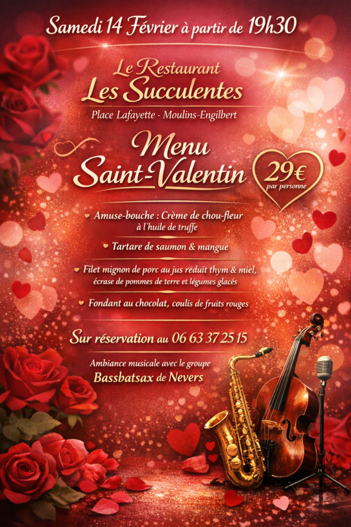Soirée de la Saint Valentin au restaurant Les Succulentes ce 14 février 2026. À partir de 19h30, menu : Amuse-bouche : crème de chou-fleur à l’huile de truffe, tartare de saumon et mangue, filet mignon de porc au jus réduit thym et miel, écrasé de pommes de terres et légumes glacés, fondant au chocolat et coulis de fruits rouges. Tarif : 29€/personne. Ambiance musicale avec le groupe Bassbatsax de Nevers. Sur réservation au 06 63 37 25 15.