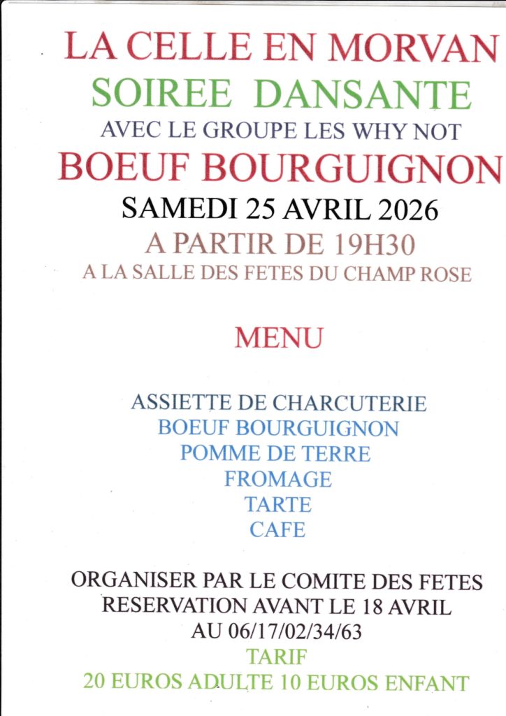 Au menu : Assiette de charcuterie, bœuf bourguignon pomme de terre, fromage, tarte, café. Réservation obligatoire.