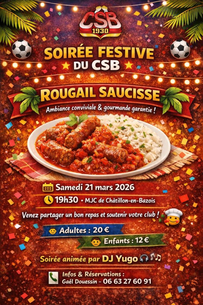 Le Club Sportif Bazois Football organise une soirée festive le samedi 21 mars 2026 pour partager un moment convivial autour d’un bon repas et soutenir le club. Dîner : Rougail saucisse, animation de la soirée par DJ Yugo. Tarif : 20€/adulte, 12€/enfant. Infos et réservations : 06 63 27 60 91.