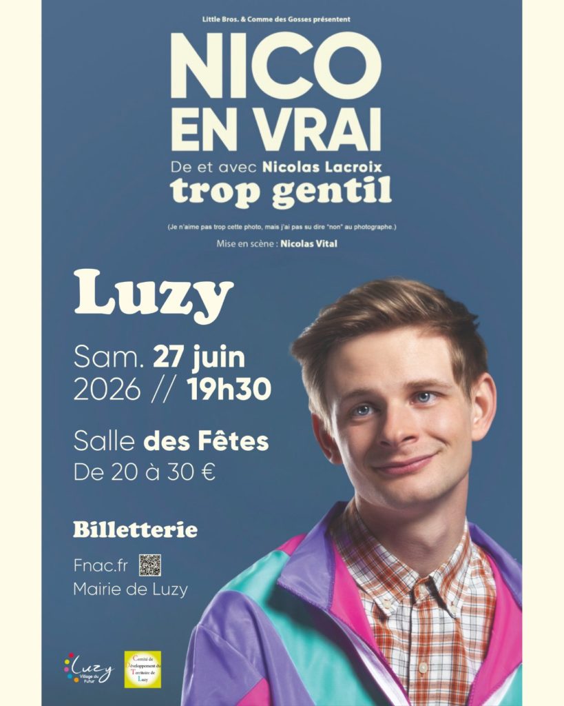 Le phénomène des réseaux sociaux, Nico en vrai, livre un spectacle mordant sur la gentillesse, la nostalgie et les absurdités du monde moderne avec humour et dérision. De et avec Nicolas Lacroix. A 19h30 à la salle des fêtes, 13 rue des Remparts. Tarif : de 20 à 30€. Billeterie : fnac.fr ou Mairie de Luzy. Infos : mairie@mairie-luzy.fr